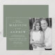 Modern fotobröllopsinbjudan som innehåller dina bröllop-detaljer till lämnat om designen i vit text med calligraphy-skript-accents på en grönt. Anpassa framsidan av inbjudan genom att lägga till namn, bröllop-information och lodräts förlovning-foto. Baksidan av inbjudan ger utrymme för ytterligare text och foton. Designad att samordna med vår moderna elegance bröllop-samling.
