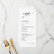 Det här menykortet för anpassadet är designat för att koordinera med vår uppsättning med romska skript i bröllop, och innehåller en rotografitext i ett svepande skript som är parad med ett serieteckensnitt i klass i svart med ett anpassade monogram på baksidan. Matchande objekt är tillgängliga.