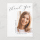 Detta moderna eleganta 1-foto examens-kort "Tack", har designelement av modern text kombinerat med elegant kalligrafi skrift. Ditt examensfoto visas på framsidan av kortet medan baksidan av kortet erbjuder personligt textutrymme för ett tackmeddelande eller kan lämnas tomt om du vill skriva din hälsning för hand. Bakgrunden är vit med svart text eller enkelt anpassa dessa till färger du väljer.
