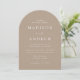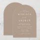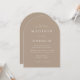 Presentera din bröllopsdag med understatement och elegans med våra minimalistiska och moderna bröllopsinbjudningar, där dina detaljer framträder i krispig vit text kombinerad med ett raffinerat kalligrafiskt typsnitt. Mot en neutral taupebakgrund ger dessa inbjudningar en tidlös och sofistikerad estetik. Den samtida bågformen tillför en unik och stilren touch, vilket gör dessa taupebröllopsinbjudningar perfekta för bröllop under alla årstider. Oavsett om du planerar en chic modern fest eller ett rustikt inspirerat evenemang, sätter dessa inbjudningar vackert tonen för din oförglömliga dag.