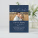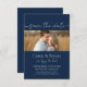 Skript för modern Elegant Spara Monogram-inbjudan för datum. Det här fotot inbjudan är perfekten med enkla eleganta och minimalistiska designfunktioner med ett foto för att hedra minnet av din speciella dag. Monogram på baksidan och minimal marin blå och vit design för bröllop, årsdag eller specialtillfälle.