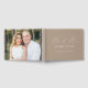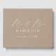 Elegant bröllop-gästbok med texten "Mr and Mrs" som visas i ett modernt, vitt kalligrafiskript på en taupbakgrund. Anpassa framsidan av den enkla gästen bröllop bok med efternamn och bröllop datum. Baksidan av gästen bok visningar förlovningen av vågrät. Lägg till ditt gift namn och bröllop till fotogästen bok.