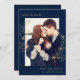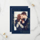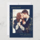 Modern och Elegant Faux Gold Foil Botanical Flowers Photo Save the Date Bröllop Card. Datuminbjudningskortet innehåller mer skripttypografi och chic för blommigt i guld och enkel design på en marin blå bakgrund som du kan lägga till ditt anpassade förlovning-foto bild till.