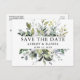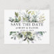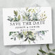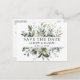 Modern Elegant Watercolor Botanical Grey Bröllop Förlovning Announcement Rädd Postkort för datum omfattar eukalyptus löv, grönt botaniskt löv, dammblått löv och andra vackra botaniska grejer.