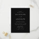 Minimalistiskt, modernt bröllopsinbjudningskort med detaljer om ert bröllop i vit text med kalligrafiska accenter. Den svarta bakgrunden kan ändras till en färg som passar er. Personliggör baksidan av det chic bröllopsinbjudningskortet med er returadress, bröllopswebbplats, bilder, etc. Designat för att samordna med vår Modern Elegance bröllopssamling.