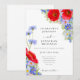 Vackra eleganta handmålade akvarell botaniska sommarvildblommor i blåklintblå, lila, rosa, röda, gröna och gula nyanser bröllopsinbjudan. Blommor inklusive cosmos, blåklint, tusensköna, vallmo och förgätmigej med lövverk. Lättanvänd mall med modern elegant typsnittskrift. Perfekt för ett unikt blommigt botaniskt blå lila tema för en sommar- eller vårbröllop. Unik originalkonst av konstnären Catherine Sweetman