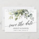 Modern kalligrafi Elegant Watercolor botanical Grey Bröllop Förlovning Announcement Save Datumkortet omfattar eukalyptus löv, grönt botaniskt löv, dammiga blå löv och andra vackra botaniska grönområden.