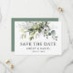 Modern Elegant Watercolor botanical Grey Bröllop Förlovning Announcement Save Datumkortet inkluderar eukalyptus löv, grönt botaniskt löv, dammiga blå löv och andra vackra botaniska grejer. Skicka tillbaka Grönten.