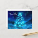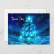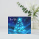Tack-kort med en modern elektrisk blå julgran. Dekorerad med lampor runt omkring. Bakgrunden har suddiga, urblekta ljus.