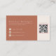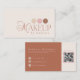 Elegant och modern visitkort designad för sminkartister. Denna sofistikerade layout har stilfull typografi, accentuerad av tre ögonskuggesinspirerade palettcirklar i champagne, rosafärgad och varm terrakotta. Baksidan har en rik terrakotta bakgrund med kontaktikoner för telefon, e-post och Instagram, plus ett praktiskt QR-kodavsnitt så att kunderna kan skanna och boka möten direkt. Alla färger är redigerbara. © Kimbellished, LLC