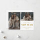 Ett modernt och minimalistiskt julkort för nyår med 2 foto collage, guld typografi och meddelandeskrift på baksidan.