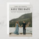 Ett modernt bröllopsfoto Spara datum-kort med en vertikal bild med rent och chic redigerbart text på framsidan. Baksidan har avtagbar text för bröllopswebbplatsen så att gästerna kan få mer information. Klicka på redigeringsknappen för att anpassa denna design.