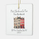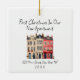 Första julen i vår nya lägenhet personlig modern och enkel keramisk prydnad med det nya adress och en gammal byggnad illustration.