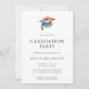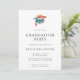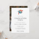 En modern inbjudan till studentfesten som innehåller en färgstark vattenfärgshatt i studenten, ett murbruk i student och en minimalistisk typografi plus ett foto på anpassningsbarna på baksidan.