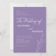 Den här eleganten, den enkla, minimalistiska bröllopsinbjudan innehåller vit blomma och modern text med en känslig lavender färg i bakgrunden.