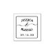 Ett modernt gummi frimärke med kvadratiskt gräns med kurvhörn och enkel typografi, modern kalligrafi som används med namn och datum.