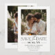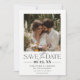Med en tidslängd och elegant med två foton sparas datumkortet med en klassisk svartvit layout med snyggt serif och handskrivet skript typsnitt. Den översta visar ditt favoritfoto på förlovningen, medan den vita bakgrunden behållor designen utan problem. Perfekt för par att planera ett modernt, chic- eller destinationsbröllop. Använda för fall- eller sommarceremonier med blommigt- eller utomhusteman. Matchning av bakåtlayout finns tillgängligt för mer anpassning.