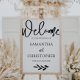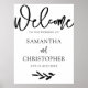 Modern och elegant bröllop-skylt med enkelt och snyggt svart skript på vit bakgrund. Anpassa med din unika information.