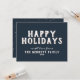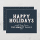 Modern Simple White Typography Glad helg Postcard. Vit typografi är på marinblå bakgrund - anpassa familjen namn och året. Baksidan är marin blå med vita prickar.