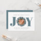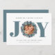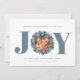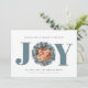 Modern Eucalyptus Photo Typography-julkort - JOY finns i modern fetstilt typografi i blått med en eukalyptus och ett kullbär som omger ditt favoritfoto. Redigerbar hälsning lyder: " Önskar en helgdag fylld med JOY." Hela vår kärlek, din familj namn och familjeblå, men du kan lätt byta färg i designen verktyg. Designad av Beverly Bainbridge Magnolia & Thistle