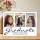 Skicka din familj och vänner ett unikt personligt fotograttis-kort för att wow dem. Denna moderna malldesign har tre foton som du kan ändra till dina egna. Under dina foton står ordet "Graduate" i svart modern handskriven typsnittsstil och ditt namn och detaljer att anpassa. Baksidan av vykortet har mer information om din examen som du kan anpassa med en svart studentmössa. Designad av konstnären ©Susan Coffey.