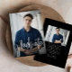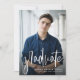 Fira din examen från gymnasiet eller universitet med detta vertikala två-fotografi-kort som också har plats på baksidan för text om examensfesten. Den moderna skrivstilen "graduate" på framsidan i vitt är perfekt för en trendig examen. Baksidan är svart med ett subtilt mönster och ett andra foto. Texten på baksidan kan anpassas för detaljer om examensfesten, examenens prestationer eller framtida planer. Denna stilrena men enkla kombination av examensmeddelande och inbjudan fungerar bra för både gymnasie- och universitetsutexaminerade och finns även tillgänglig som digital nedladdning för examensmeddelande och inbjudan. Hitta fler färger och stilar samt dekorationer för examensfest i kollektionen från Lea Delaveris Design.