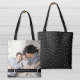 Anpassningsbarna tryckte 2-sidig, reversibel tote bags-personlig med foton och text. Den här moderna minimalistiska designen har en stor text i ett skript i en familj som är överlagrad på fotot med ditt namn monogram och din familj har fastställt datum nedan. Omvänd sida har en söt svart och vit punkt mönster eller välj anpassningsbarnas bakgrund färg. Använda designen verktyg för att lägga till fler foton och redigera texten typsnitt och färg för att skapa en unik design av ett slag. Anpassningsbar fotot tote bags gör en underbar gåva till familj och vänner!
