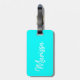 Blått cyanblått kollage-bagagemärke med brev och namn på baksidan.