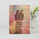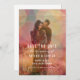 Det här moderna bröllop spara datum-kortet i snyggt har en fullt utfallsmall, tillsammans med en färgstark övertäckning i ljus i pinkar, guldfärgad gult, persikor och lavender. Unik och drömmande - perfekt att meddela din förlovning!