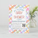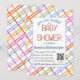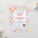 Meddela din fest med denna moderna och färgglada rutmönstrade baby shower-pappersdesign. Med skärande pastellfärgade ränder i rosa, korall, blå, grön och gul ger detta glada rutmönster en fräsch och modern look som känns lekfull men ändå polerad. Den kräsna vita mittpanelen håller layouten ren och lätt att läsa samtidigt som den färgglada ramen sticker ut.