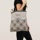 Upgrade your daily carryall with this sophisticated Beige and Charcoal Plaid Tote Bag. Perfectly blending the "Modern Farmhouse" aesthetic with "Quiet Luxury," this tote features a crisp horizontal split design. The top section, in a clean minimalist beige, showcases your personalized name in a timeless serif font, while the bottom features a classic diagonal plaid pattern in tan and deep charcoal tones. A sleek black line at the top provides a designer finish that perfectly anchors the sturdy black handles. Whether you're heading to the farmer's market, the library, or the office, this durable and stylish bag is designed for versatility. It makes a thoughtful, high-end gift for birthdays, teachers, or bridesmaids. Personalize it today to add a touch of understated elegance to your wardrobe.