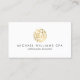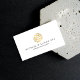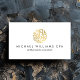 En abstrakt, ett cirkulärt nummermotiv skapar en spännande logotyp om detta moderna affärskort för revisorer och professioneller för redovisningstjänster. Visas i faux guld på vitt för att fånga öga. Originalteckning och design © 1201AM-KREATIV