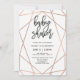 Den här inbjudan till babyduschen i snyggt har en modern geometrisk design för faux ro guld på vit bakgrund, med modern svart typografi.