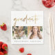 Modern och chic studentfest napkin med faux guld student-skripttypografi, två foton, namn och klassår i svart text på vit bakgrund.