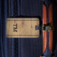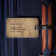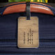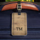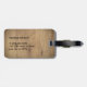 Elegant anpassade blå bagagemärke med svart linjer, faux wooden bakgrund och fet monogram.