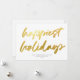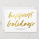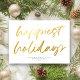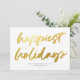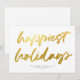 Det här moderna men festliga visitkortet för företag har ett stort kalligrafiskt skript "lyckligaste helgdagar" i faux guld-folie över en vit bakgrund. Kortets baksida är också vit. Bakgrunden färg och färg är anpassade. DESIGN TIP: Du kan anpassa den här designen ytterligare genom att lägga till ett foto, en logotyp och/eller ytterligare text på baksidan.