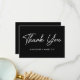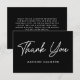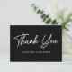 Ett enkelt babyduschkort som visar "Tack" på framsidan i ett fet vitt skript med svart bakgrund. Anpassa kortets framsida med ditt namn eller din anpassningsbar. Baksidan av det svarta och vita tacket som du kortar visningar ditt anpassningsbar-meddelande och namn.