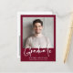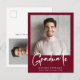 Modern burgundisk röd studenten-vykort med ett fet, vitt skript i snyggt med foto och "Student". Lägg till klassens namn, skolår och klassår i enkel vit typografi. På den motsatta sidan lägger du till ytterligare ett foto- och personlig-meddelande eller lämnar tomt.