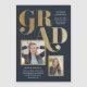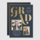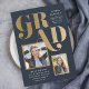 En modern examensinbjudan och underrättelsemagnet med en djärv metallisk typöverläggning och två fotodesign.