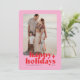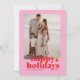 Ett ljust modernt fotofirande vykort med fet typografi i rött på en färgrik rosa bakgrund med ett rött stjärnmönster på baksidan. Fotot, namnet och året kan enkelt anpassas för en personlig touch. En rolig, färgrik och modern juldesign för att sticka ut under denna högtidsperiod!