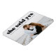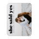 Meddela din kommande bröllop med våra stilrena moderna fetstilade svarta typografi-spara-datum-fotomagneter. De moderna spara-datum-magneterna visar ert förlovningsfoto med "hon sa ja" i en fet svart textöverlägg. Anpassa magneten genom att lägga till era namn, bröllopsdatum och bröllopsplats.
