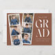 inbjudningskort för studentfest av trendig med en filmremsa med 6 kvadratfoton av student. "Grad" visas med vit, modern text med brun bakgrund (färg kan bytas ut mot bakgrund). Anpassa framsidan av multifoto-studentfesten inbjudan genom att lägga till student namn, skolan namn och studenten. Inbjudan återgår till visning av studentfesten med vit text med brun bakgrund. Den moderna studentfesten inbjudan är perfekt för studenter i högskolan och högskolan.