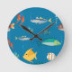 Modern fisk och sjöhästar illustrerad mönsterblå rund klocka