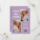 Dessa moderna och stilrena lila bröllop "spara datum"-kort har tre bilder av paret, samt fet, vit text på en ljuslila bakgrund. Lägg till din QR-kod för din bröllopswebbplats eller för att gästerna ska kunna svara online.