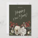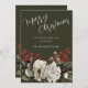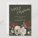 Modern "Merry Christmas" seasonal greeting. Elegant floral sprays with red berries, and script typography on a dark green background. Double-sided, with "Happy New Year!" on the back. Customize by adding your own family name.