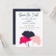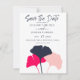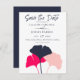 Få ut ord om ditt kommande bröllop med de här Spara datumkorten. Skapa en påstående med fet färger och en ren och enkel bild. Symboler på ginkgo-löv i marinblått, lätt rosa och en ljus korallfärgad magenta. Den motsatta sidan är en ren marin blå.