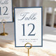 Det här navblå bordskortet ger ett klassiskt utseende åt dina mottagningsbord med en marinblå ram som inramar designen på ett tidlöst sätt. ”Table” visas i elegant kalligrafi högst upp, med ett stort serif-bordnummer centrerat nedanför för enkel läsbarhet. Paret namn och bröllopsdatum visas nedan, vilket ger en personlig touch som passar vackert med formella, traditionella och kustinspirerade bröllop. Detta kort mäter 3,5 "x5". Redigera varje bordnummer individuellt och lägg till dem i din varukorg för att säkerställa en smidig beställningsprocess.