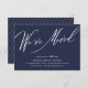 Nytt adress tillkännagivande av marin blå Vi har flyttat med ett modernt skriptteckensnitt med en koordinerande baksida.