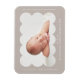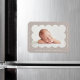 Modern födelsemagnet som visar ditt barns foto i en snidad ram i taupe. Anpassa din födelseannons genom att lägga till ditt barns namn och ytterligare information i vit text.