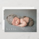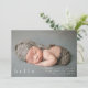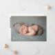 Modern födelseanmälan med ett enkelt "välkomstkort" på framsidan och ett alternativ för dig att ladda upp dina egna speciella tre foton på baksidan.